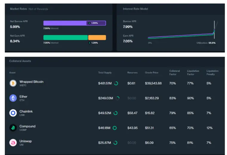 可以看到 Earn Distribution 这一块儿除了 DAI 以外均为 0%。也就是 Compound 的代币激励促进 TVL 已经完全专注在 Compound III 上了。