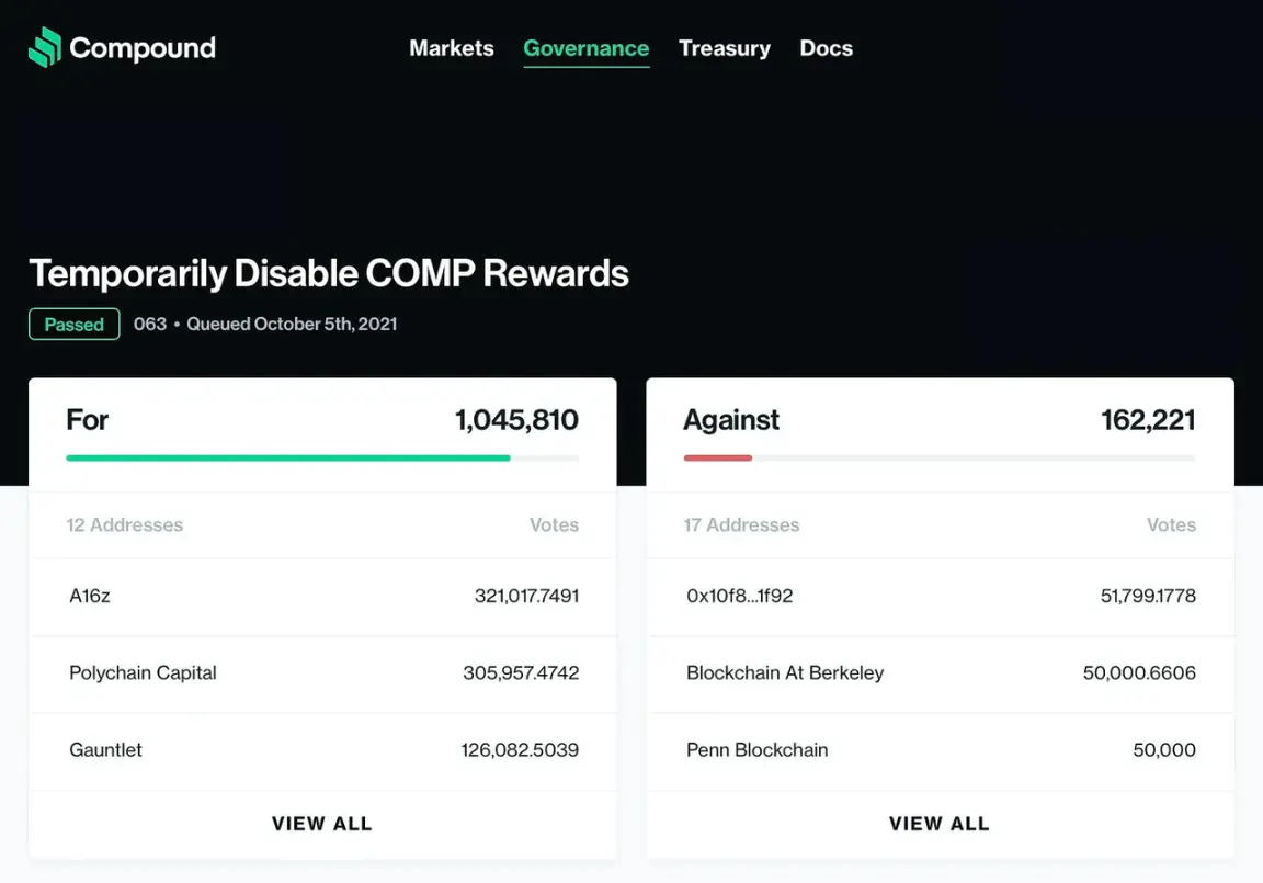 有 12 位民意代表投票赞成,另外 17 位投票反对。只不过去中心化治理计算的不是人数,而是 COMP 币的「票数」。终场以 100 万赞成票,对上 16 万反对票通过提案。