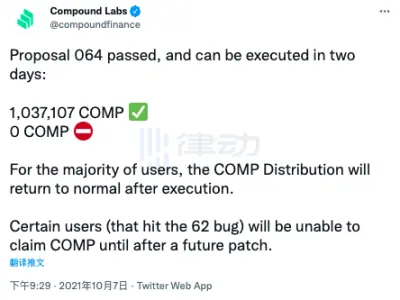 10 月 8 日,去中心化借贷协议 Compound Finance 宣布通过「修复 COMP Accrual Bug」的 064 提案,该提案目的为修复此前流动性挖矿 COMP 分配异常的 bug。提案称,这次更新将尝试「修补因执行提案 062 而引发的 token 分发漏洞。」在问题完全解决之前,与 6 个受影响交易市场 (cTUSD、cMKR、cSUSHI、cYFI、cAAVE 和 cSAI) 交互的用户将无法从其质押持有的 COMP 中获得奖励。