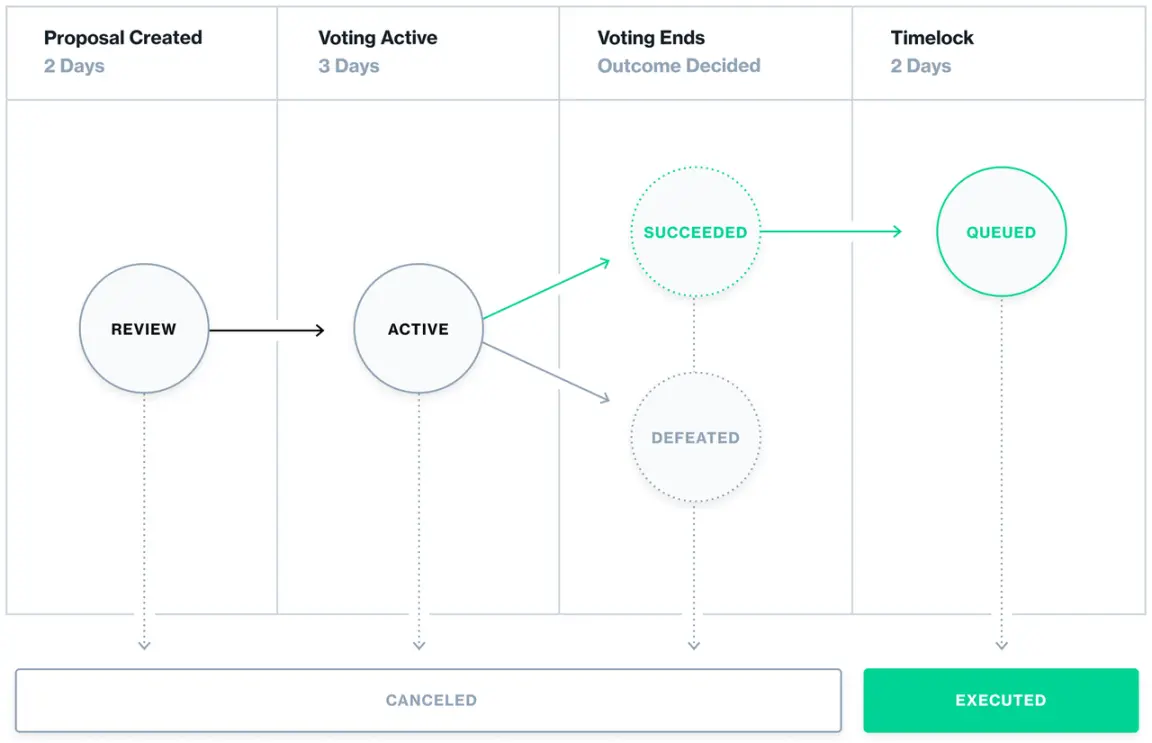 COMP 代币持有者可以将投票权委托给自己或他们选择的地址。授权至少 25,000 个 COMP 的地址可以创建治理提案;任何地址都可以锁定 100 COMP 创建自治提案,被委托 25,000 COMP 后成为治理提案。 治理提案创建后,将进入为期 2 天的审核期,之后记录投票权重并开始投票。投票持续 3 天;如果该提案获得多数票,且至少有 400,000 票,则该提案将在 Timelock 中排队,并可在 2 天后实施。总的来说,对协议的任何更改至少需要一周的时间。