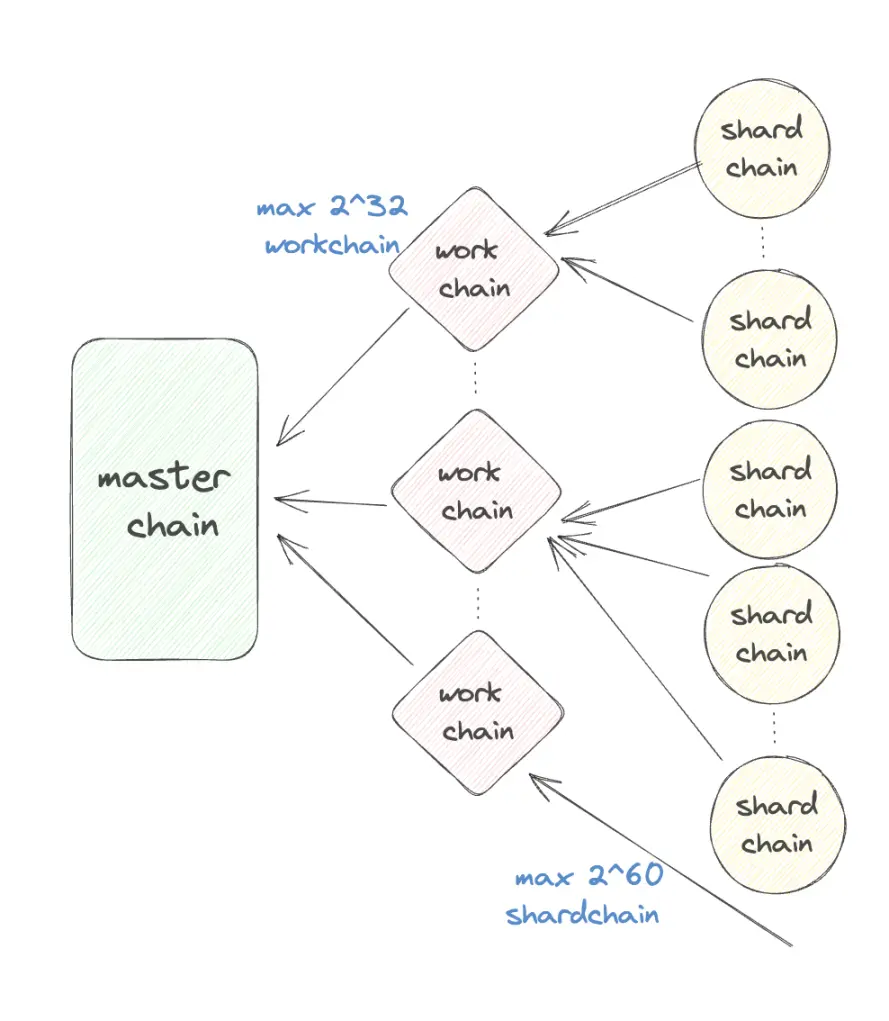 TON 的分片是自下而上的:区块链分片方案普遍采用自上而下的方式,即先建立单一的区块链,然后将其分解为若干交互式的区块链,以提升性能。然而,TON 分片方案采取了一种自下而上的方式:将这些账户链组织成碎片链(Shardchain),使得账户链(Workchain)在分片链中仅存在纯粹的虚拟或逻辑形式。TON 实现了多条链并行处理交易,被称为「blockchain of blockchains」。通过这种方式,可以有效提高系统性能;