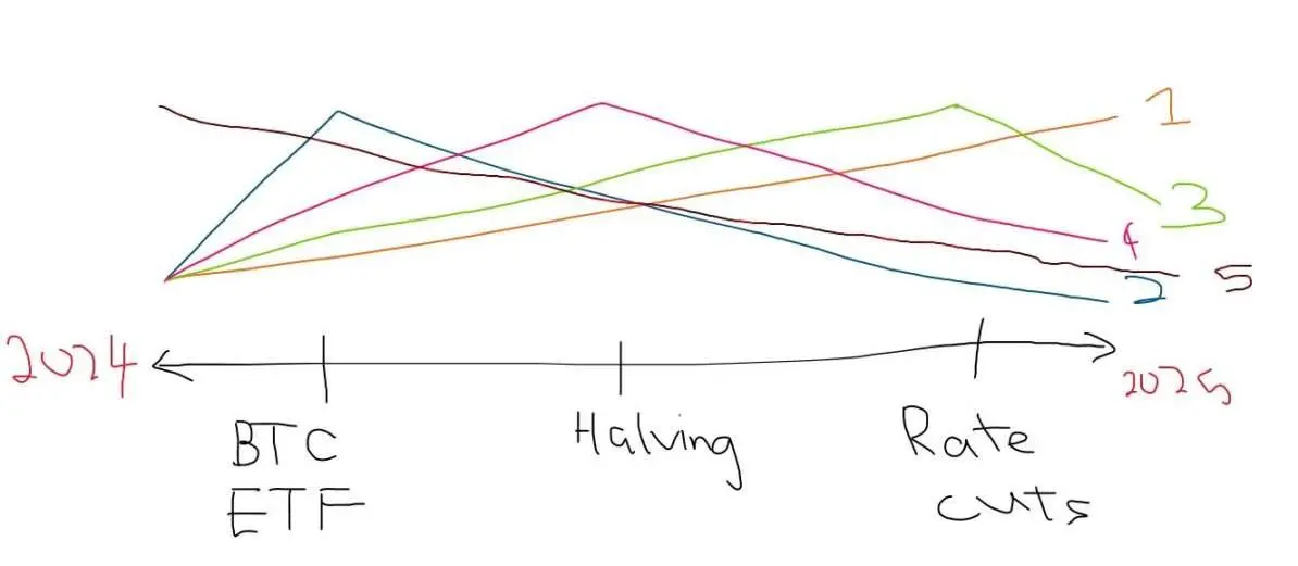 ETF、减半、利率削减主要是为更大的牛市搭建长期的舞台。2024 年的绝对不是简单上涨。