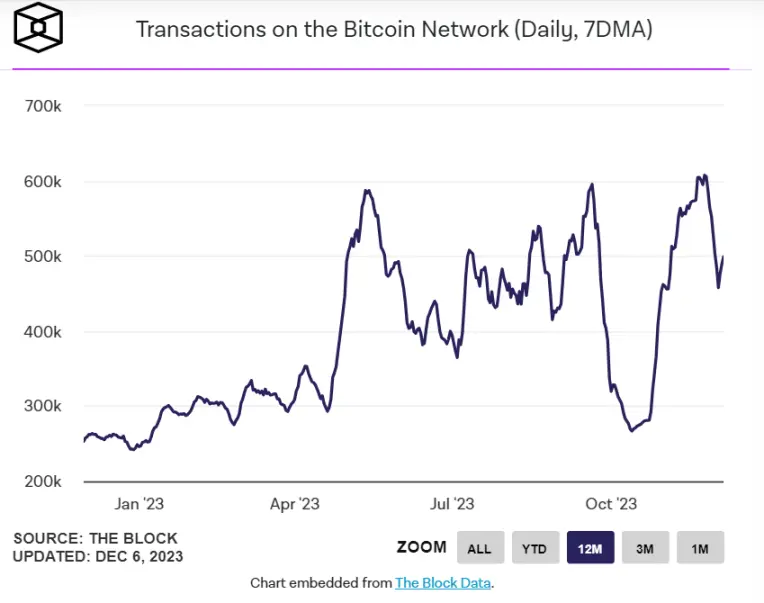 根据 The Block 数据显示,今年比特币网络上的交易在不同时期出现激增。与此同时,与铭文相关的活动也有所增加,11 月份比特币的日均交易量达到了 60.7 万笔,创历史新高。