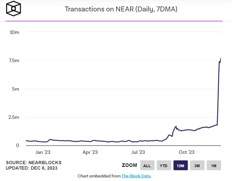例如,根据 The Block 数据显示,Near 区块链的日均交易量在本月因铭文飙升至历史新高。