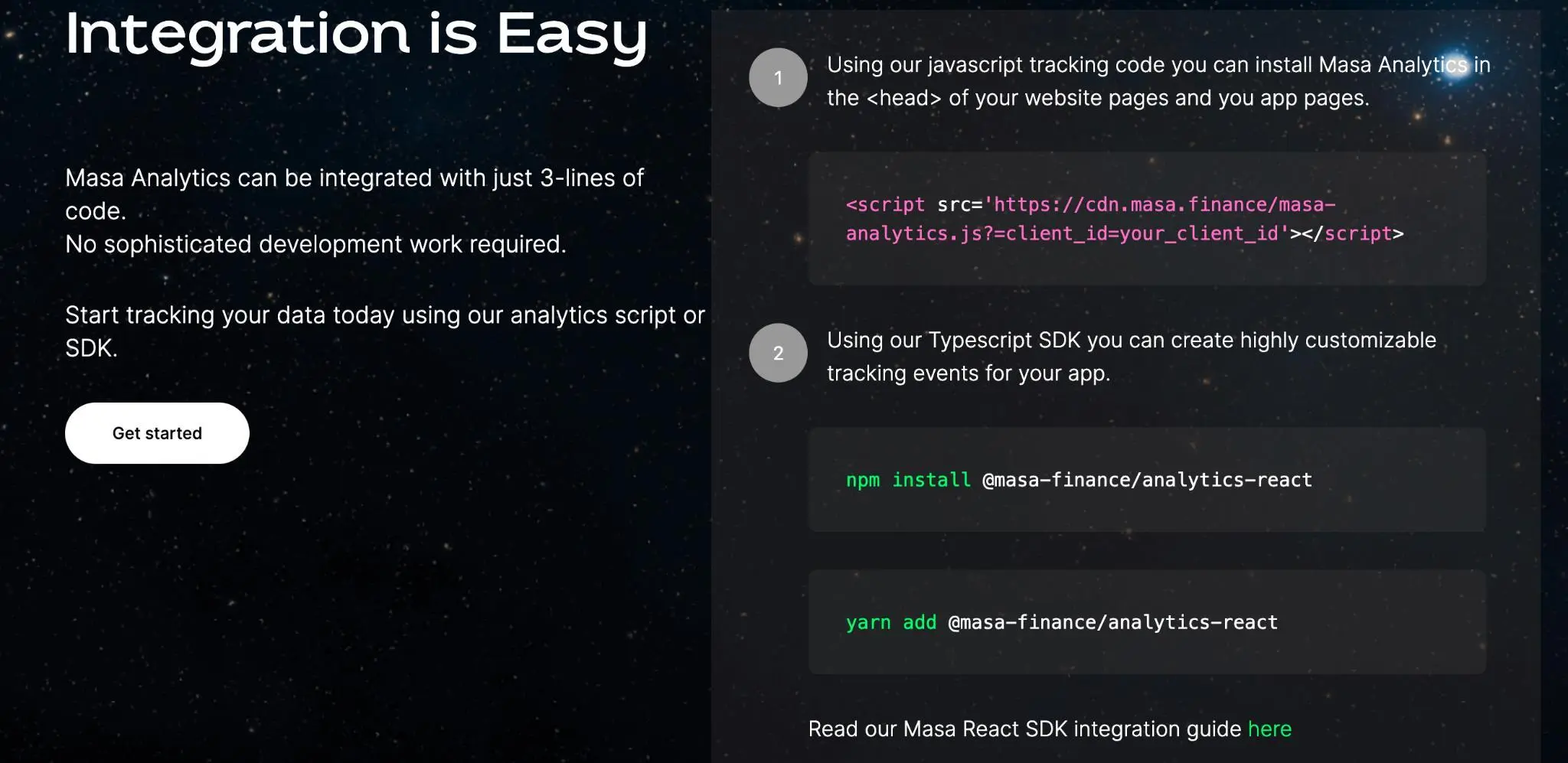 Masa Analytics 同样可以对上述指标进行分析,有需求的网站和开发者可以集成 Masa 提供的 Java 追踪代码或使用其 Type SDK,随后就会生成一个无 s 的脚本,以追踪用户在目标网站上的行为,包括但不限于页面访问、点击事件、表单提交等;