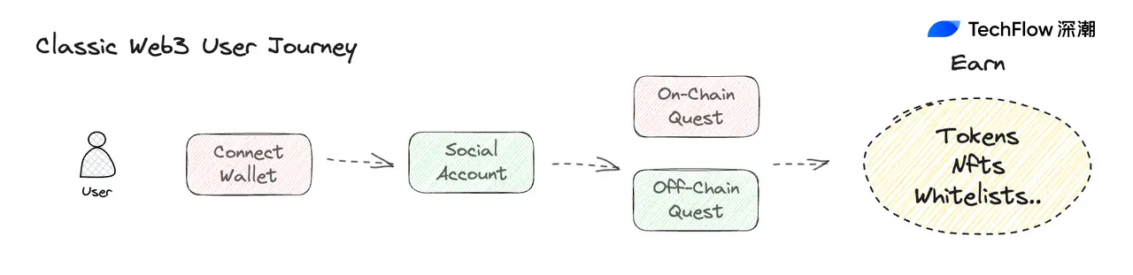 一位 Web3 用户常见的旅程,往往从链接自己的钱包账户开始,随后关联自己的社媒账号,并完成项目方所要求的各类链上链下任务,最后获得奖励,如 NFT,代币或白名单等…