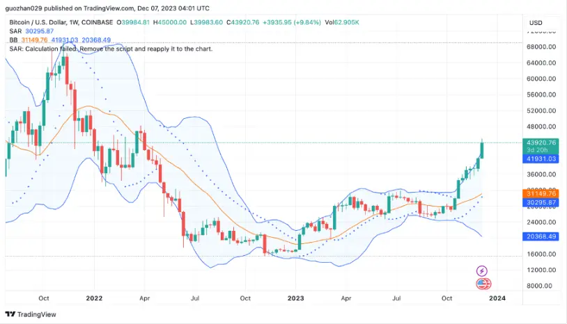 BTC 大涨突破 42000,重新回到 22 年 4 月 LUNA 暴雷时的水平。BTC 铭文生态的繁荣,叠加现货 ETF 通过的预期,以及明年即将到来的减半周期,共振了这次大幅上涨。微策略上月又购买 6 亿美元的 BTC,目前合计持仓 50 多亿美元,成为最大受益者。接下来的 48000 是这轮下跌的起点,届时解套的人或倾向卖出,或是更大阻力位。