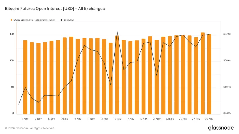 期货持仓量:本周 BTC 总持仓量小幅上涨,基本同步价格波动。