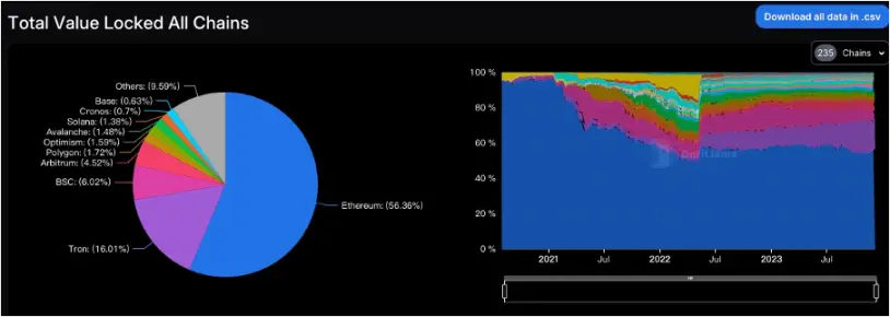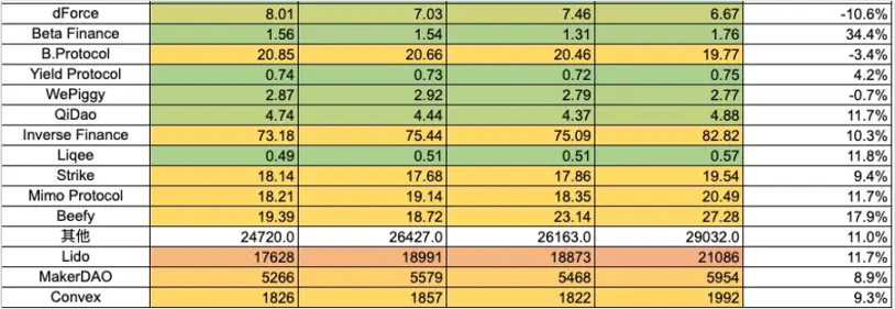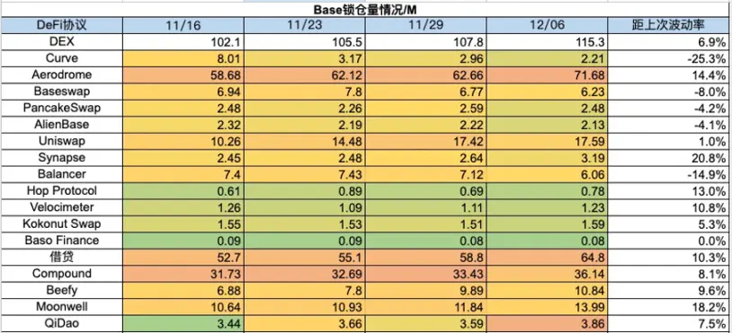 本周 TVL 整体上涨 3.6 亿美金,上涨 7.8% 左右。这周大盘大幅度增长,BTC 成功突破 38000 的价格,并且直接达到 44000。本周 TVL 大幅上涨,前二十的主流公链全部大涨。ETH 链上涨 8.3%,BSC 链上涨 2.4%,TRON 链,ARB 链,POLYGON 链均上涨 7% 左右。BASE 链上涨 10% 并且在协议数量已达到 194 个,有望 2024 年之前在协议数量上完成对 OP 的超越。