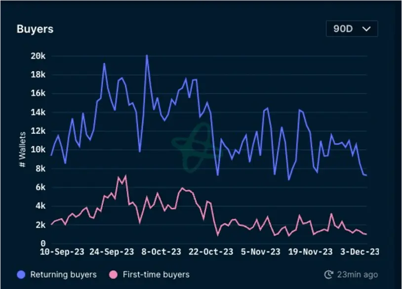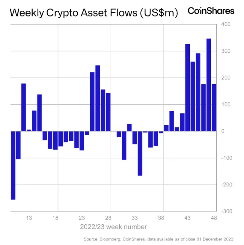 货币流动性改善。美联储紧缩周期到了尾声,首次降息的时机是全球资产的关键所在,而降息的关键则在于就业数据。美国就业人数连续 4 个月放缓的同时,薪资增速也进一步降温。美国 10 年期国债利率从 10 月的 5% 降至目前的 4%,稍微缓解了对金融局势紧张的担忧。美股市场震荡,投资者担心未来经济衰退。加密市场表现强势,再创一年多新高。