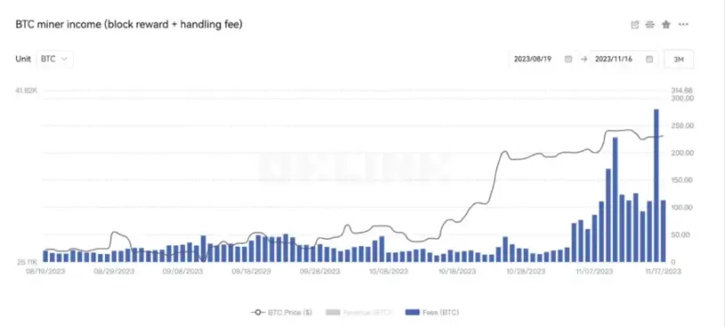 BTC 自 2020 年以来首次在日收入上超过 ETH。BTC 铭文市场发展,大幅改善矿工手续费收入。BTC 链上手续费占比从 8 月的 2% 上升至 11 月的 25%,主要得益于 Ordinals 交易对的引入。预计到 2024 年 4 月减产时,该比例或达到 50%。