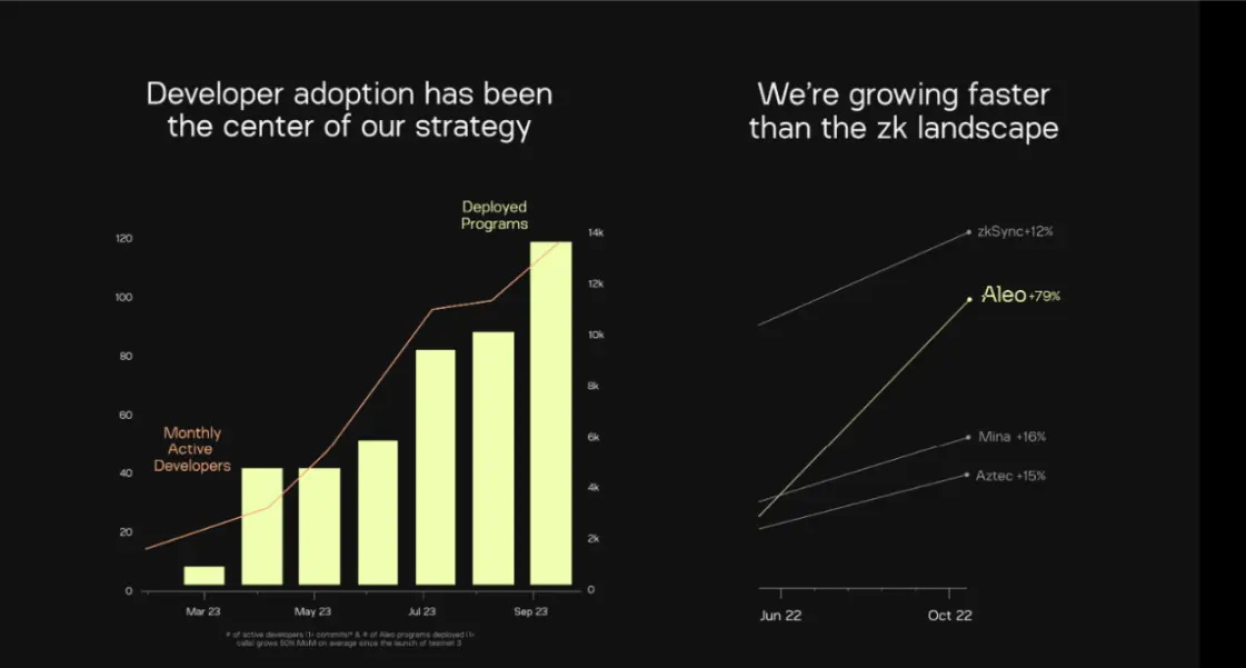 这些数字与其他比较流行的区块链平台相比,其实已经属于优秀的表现,所以虽然 Aleo 还没有上线主网,但测试网上的月活开发者已经跟很多主流区块链平台的月活开发者数量相似,其次我们的月活开发者增长率是 79%。
