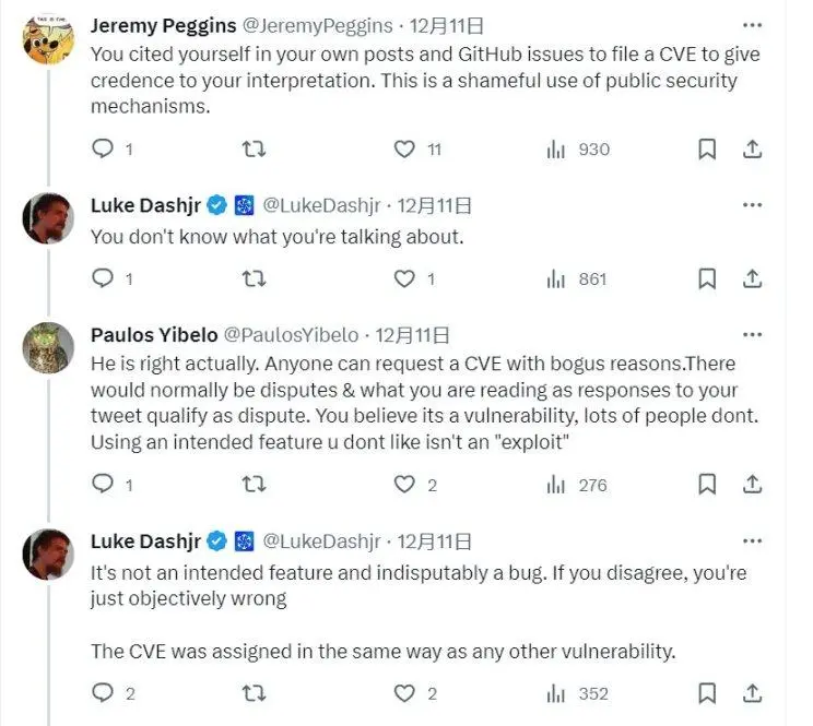 「铭文这个问题被分配了个 CVE 编号,这是釜底抽薪了,态度鲜明地定性漏洞了。CVE 编号不是什么新鲜事,许多安全团队 / 个人都可以申请,我们没太看重这玩意……但可能比特币生态相关角色会看重这个,毕竟 CVE 编号在安全行业是最知名的漏洞证明之一。」