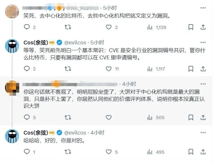 虽然余弦一再表示自己也玩(研究)铭文,「感觉铭文会有其他出路,希望看到更优解」,但「铭文漏洞被官方盖戳认证」还是在加密社区引起讨论。一些人并不认可这次 NVD 的认证,并表示去中心化的比特币不应该靠中心化机构来定义。