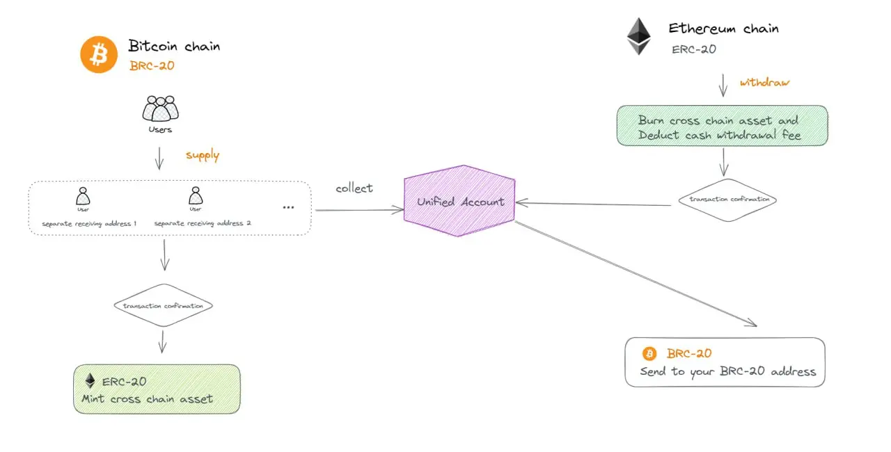 MultiBit 简化了比特币 BRC20 和 EVM 网络之间的代币跨链转移流程。具体跨链实现过程为,首先用户将跨链的 BRC20 代币存入到 Multibit 提供的 BRC20 地址上,等 Multibit 协议确认后,将在相应的 EVM 目标链上铸造并释放代币给用户。当用户想要将 BRC20 代币跨回时,Multibit 将从 EVM 链中销毁相应数量的代币,并在比特币链上释放对应的 BRC20 代币。