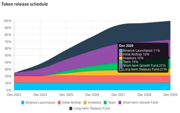 除了币安 LaunchPool 的 11%,其他代币分配部分还包括:初始空投、团队、投资者、短期增长基金与长期财政基金,分配比例如下表所示。其中值得注意的是: