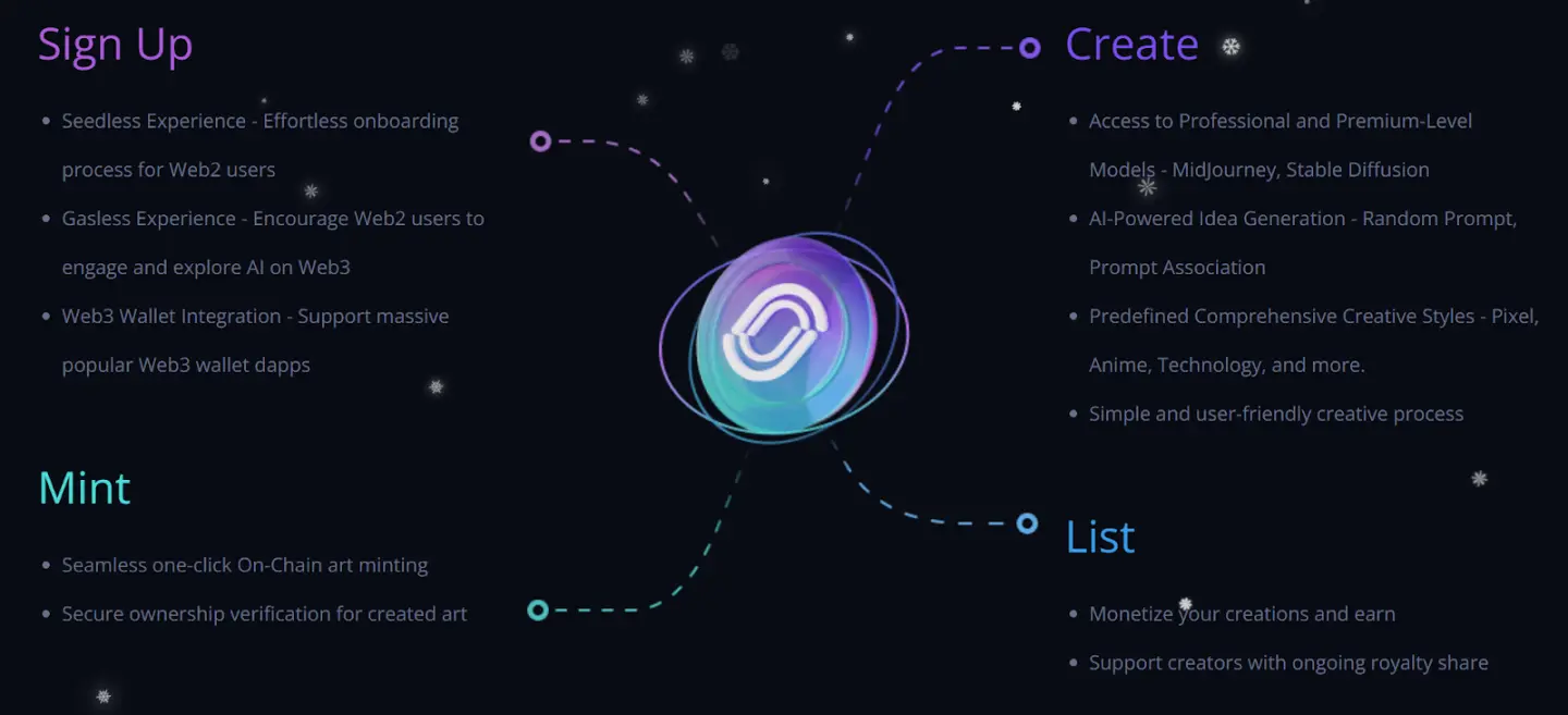 在 NFP 上,用户体验的核心是极致的简便性和创新性。用户仅需使用普通邮箱或者 Web3 钱包注册,并输入一个 (指令或创意概念),平台的系统即可利用最新 AI 模型(包括 DALLE 3、Stable Diffusion 和 Midjourney V5)快速生成相应的内容,涵盖文本、图像和音频等多种形式。这些生成的内容可根据用户需求灵活呈现,无论是作为独立的艺术作品、商业广告内容,还是个性化的社交媒体帖子。这一特性极大地简化了创作过程,特别是对于那些可能缺乏特定技能或资源的创作者,降低了进入门槛,提供了前所未有的便利和效率。