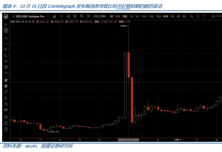 过去,美国资本市场提交的比特币现货 ETF 多次被 SEC 拒绝,理由主要是比特币市场投资者保护不足。当地时间 10 月 16 日,行业媒体 Cointelegraph 在 X(原 Twitter)上发布消息称贝莱德申请的比特币现货 ETF 产品 iShares 获得 SEC 批准,此消息刺激下,比特币从 27900 美元飙升至 30000 美元,随后在证实是假消息后调整后回落至 27900 美元左右,致使价值近 1 亿美元的加密货币头寸在不到一个小时内就被清算。类似这种情况在加密货币市场并非罕见,因此 SEC 的担忧也并非全无道理。