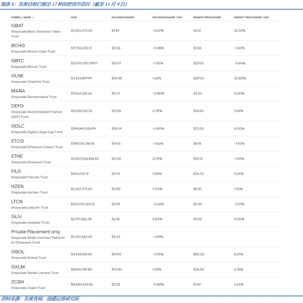 在比特币现货 ETF 批准之前,灰度(Grayscale)的比特币等加密货币信托是传统金融市场投资加密货币资产的替代产品。截至 11 月 4 日,灰度已推出包括 BTC、ETH、加密货币大盘指数等多种加密货币信托。