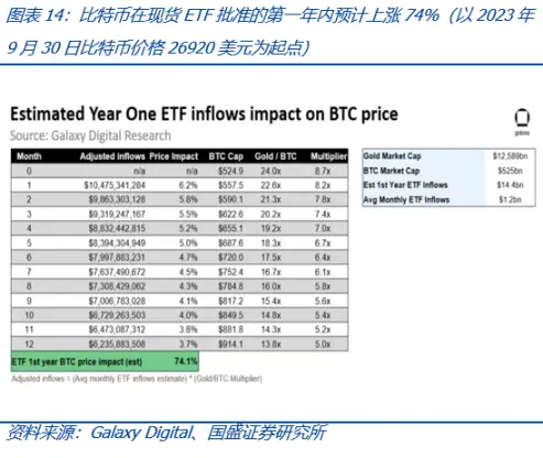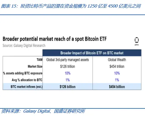 **参考黄金 ETF 推出对金价的推动,比特币现货 ETF 值得期待。**黄金 ETF 的推出对金价产生积极推动,这对比特币现货 ETF 有着积极的启示。需要注意的是,世界对黄金的认可并非由现货 ETF 而产生,而若比特币现货 ETF 获批,则意味着庞大的传统财富世界对比特币、甚至 Web3.0 世界的认可,将进一步加速两者的融合。这是一个从 0 到 1 的过程,边际变化远超是黄金 ETF 获批。当然,另一层面不同的是,比特币总数固定在 2100 万枚,而黄金仍然有不断的新增产出。比特币现货 ETF 在美获批,有望带来增量资金。Galaxy Digital 测算得到的结论是:比特币在现货 ETF 获批的第一年内预计上涨 74%(以 2023 年 9 月 30 日比特币价格 26920 美元为起点);在较长时间内,投资比特币产品的潜在资金规模为 1250 亿美元至 4500 亿美元之间。