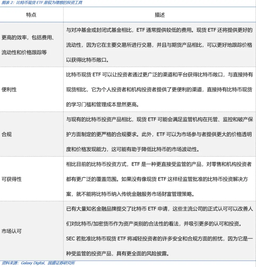 **比特币现货 ETF 以比特币现货为基础资产,是传统资本市场投资者持有比特币的一种合规投资工具。现货 ETF 能否在美获批,是市场最为关注的焦点。**比特币 ETF 允许投资者获得比特币和相关资产的敞口,而无需进行研究、购买或存储实际的加密货币(或衍生资产),在合规性、费用、流动性和管理成本等方面非常适合更广大的资本市场和投资者。因此,市场一直期待美国 SEC 尽快批准比特币现货 ETF。