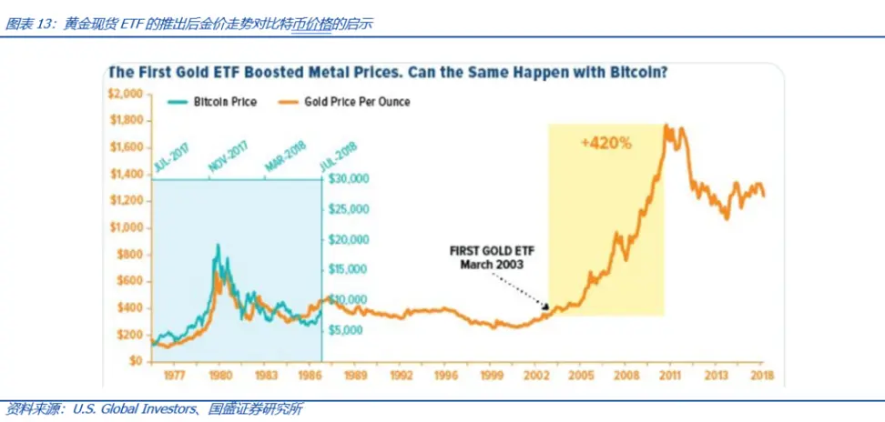 U.S. Global Investors 在归纳黄金 ETF 推出的经验后,认为在 2004 年推出黄金现货 ETF 后,随着流动性和程序化交易增加,黄金价格上涨 420%,黄金的经验说明现货 ETF 确实很重要,这对比特币现货 ETF 推出后的市场影响提供一种经验参考和启示;因此认为比特币现货 ETF 的推出也将打开相关板块上涨的空间。