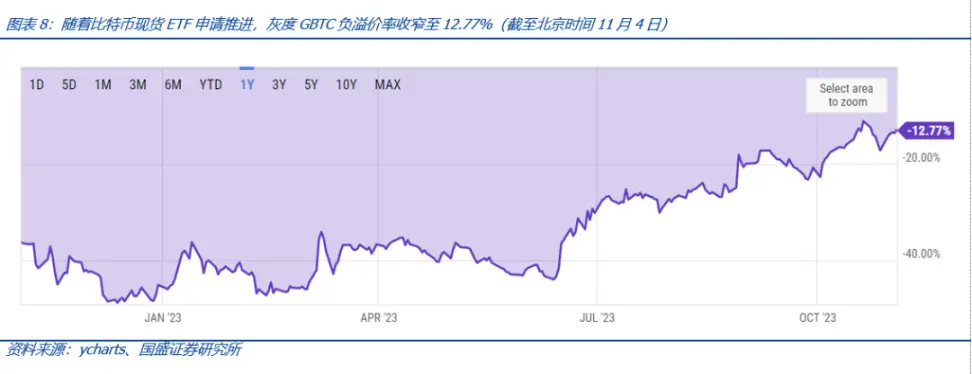 虽然灰度赢得诉讼虽然不意味 GBTC 将马上自由转换为 ETF,但市场认为比特币现货 ETF 越来越近了,此次胜诉为市场注入了很大的信心。受此系列消息影响,截至 11 月 4 日,灰度比特币信托负溢价率持续收窄至 12.77%。
