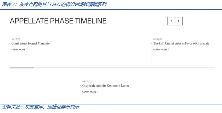 类似 GTBC 这些产品,投资者可以直接在二级市场购买、交易 GTBC 股票,但作为封闭基金,目前没有明确的赎回规则。在较长的一段时间内,GTBC 一直保持负溢价,为解决流动性问题,灰度试图将 GBTC 转为 ETF。2022 年 6 月 29 日,SEC 拒绝了灰度关于将其比特币信托(GTBC,Grayscale Bitcoin Trust)转为 ETF 的申请,而后经灰度申诉,2023 年 10 月 23 日华盛顿特区巡回上诉法院做出了最终裁决,命令 SEC 取消拒绝灰度比特币现货 ETF 申请的决定,认为 SEC 拒绝灰度试图将其价值约 170 亿美元的 Grayscale 比特币信托基金 (GBTC) 转换为现货 ETF 的决定是「武断且反复无常」的。这意味着 SEC 必须重新受理灰度将 GBTC 转换为现货 ETF 的申请,当然,其结果仍然有拒绝的可能,但 SEC 必须给出新的有说服力的理由。为了显示 ETF 对灰度的重要性,灰度特地在其官网开辟一个诉讼页面板块,将其与 SEC 的诉讼以时间线的形式展示,这也反映出灰度对比特币现货 ETF 的执着和决心。