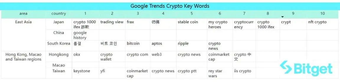 【东亚区】 热搜: aptos、yfi、stablecoin;