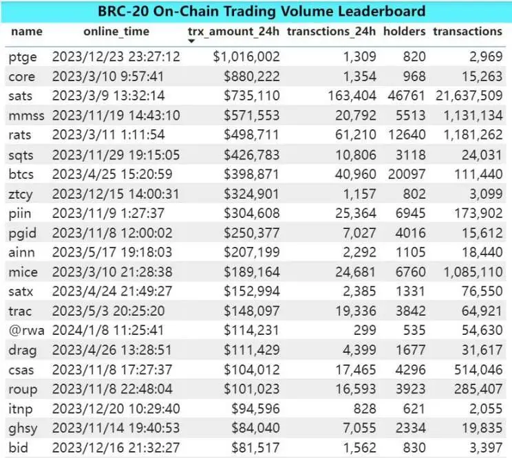 PTGE(Token):较新的 BRC-20 资产,24 小时交易量超过个 BTC (约 100 万美金),但交易笔数仅 74 币,855 holders,可能多为庄家和大户倒手。