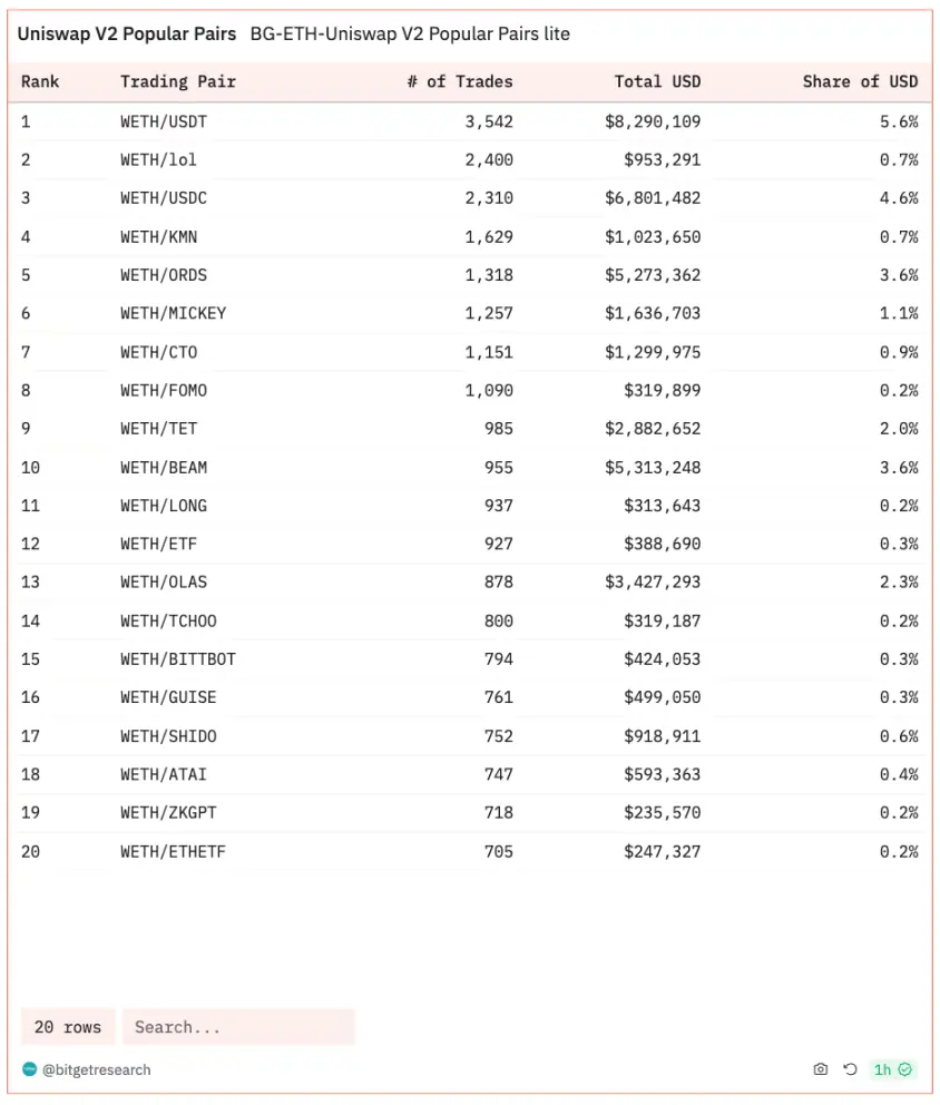 ORDS(Token):Ordiswap 是链接 brc20 的 swap,产品包括 swap、bridge、稳定币 BTSD(Ordiswap’s Bitcoin Standard Dollar ) 等,代币 ORDS 过去 24h 链上交易量 = $5.35M,24h 交易笔数 = 1365;