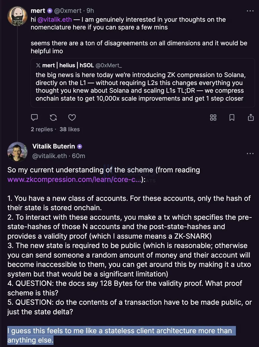 为了让以太坊社区信服,Mert 在 Farcaster 上点名以太坊创始人 Vitalik,让其点评 ZK Compression 的技术原理。而 Vitalik 也做出了认真回应,并表示该技术更像是一个无状态的客户端架构。