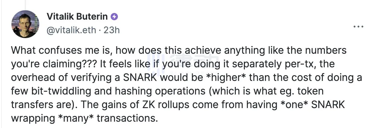 随后,Vitalik 再次发文表示疑惑,他认为 ZK Compression 声称的数字就像,如果每一次单独做,验证 SNARK 的开销会比做一些小动作和哈希操作的成本要高 (例如代币传输)。ZK rollup 的收益来自于「一个」SNARK 包装了「许多」交易。