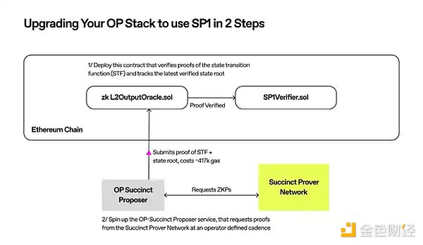 据官方 GitHub 介绍其过程只需安装 Rust、Foundry 和 Docker,即可将现有任何的 OP Stack rollup 升级到 Type-1 zkEVM rollup,并且流程仅简化为两步:1. 部署 ZK L2OutputOracle.sol 合约;2. 启动 OP Succinct 提议服务(流程见 GitHub 扩展链接 2)。