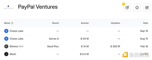 PayPal 在去年 8 月推出 PYUSD,看似入局较晚,其实是 PayPal Ventures 早在 2019 年便有加密项目投资纪录。今年有 4 笔投资,共三个项目,其中链上风控公司 Chaos Labs 共三轮融资皆有参与 (种子轮于 2023 年领投)
