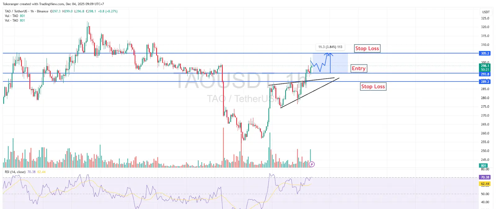 TAO通过形成小型上升楔形呈现出清晰的上升趋势,表明买盘正在推高价格接近关键阻力区域$305.2。只要价格维持在支撑位$293.8上方,上升动能有望继续,因为RSI仍处于看涨区域且未显示极端超买迹象。如果情况顺利进展,TAO可能会出现轻微回调,然后向止盈目标$305.2上升。止损应设在$289.2下方以防止上升结构被破坏。