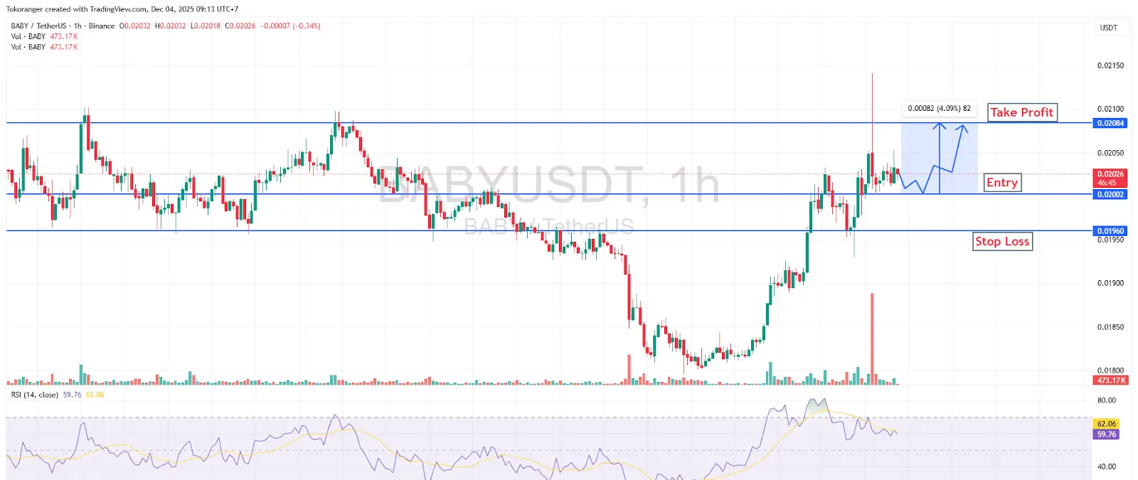 BABY在支撑位$0.02002处找到支撑后,正在尝试反弹至阻力区$0.02084。蜡烛形态显示出健康的回调模式——短暂下跌后再次上升,这通常表明买家开始重新掌控动能。RSI在59-62区间,表明买盘力量仍然温和,尚未进入过度买入区域。