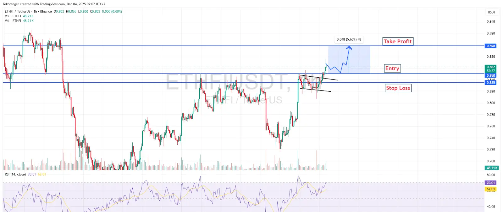 ETHFI目前呈现出清晰的看涨信号,在$0.85-$0.86区间形成了看涨延续形态。突破倾斜趋势线的蜡烛表明买盘动能开始增强。RSI稳定在60区域上方,这通常标志着看涨阶段的开始。只要价格保持在入场点$0.850上方,ETHFI有望继续上升至关键阻力$0.898。