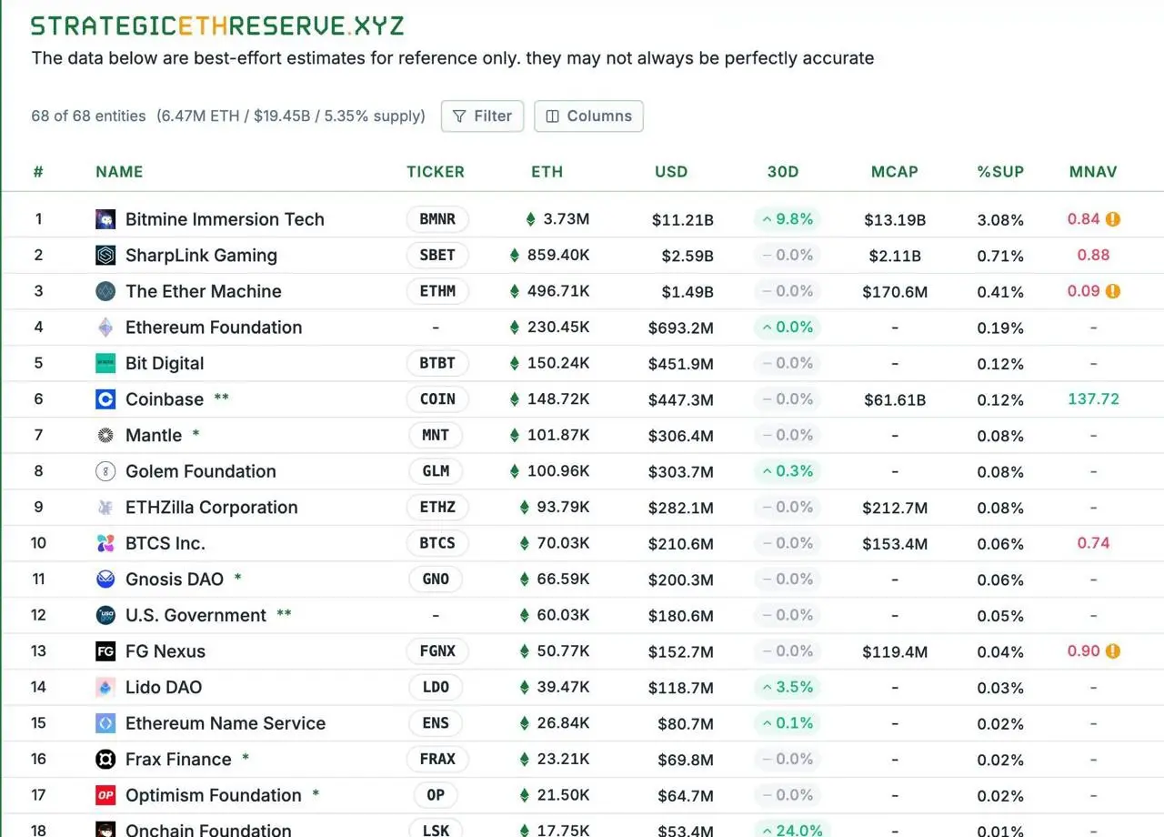 StrategicReserve数据显示,在追踪的68个实体中,共持有647万ETH,价值约194.5亿美元。尽管大多数顶级金库的30天变动持平,BitMine却大幅扩张,仅在过去一个月就新增67.9万ETH,价值约21.3亿美元。