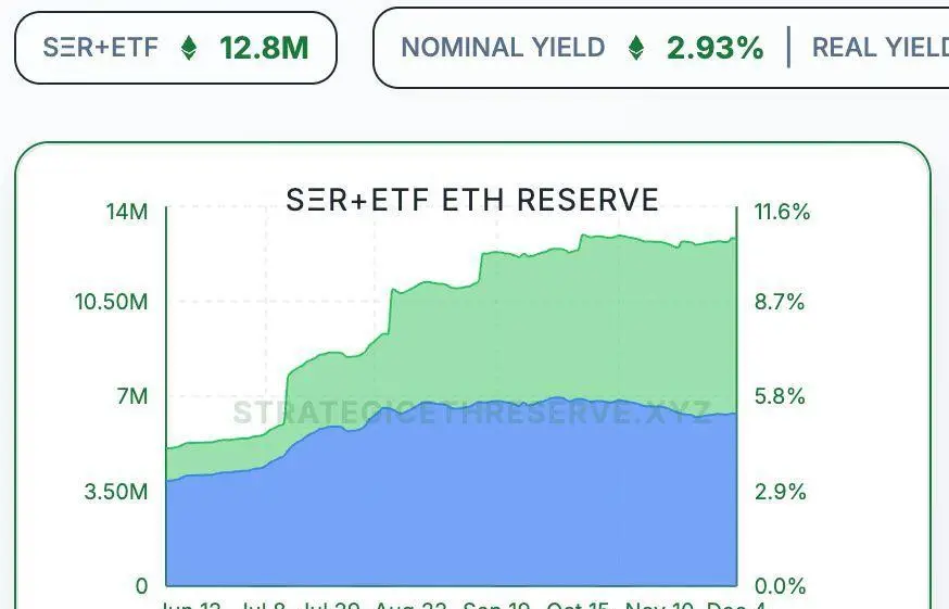 SER+ETF图表显示,从6月至12月,总ETH储备稳步上升,从350万ETH以上增至近1400万ETH。图表突出显示了下半年持续的流入,即使直接DAT买入放缓,储备水平依然保持高位。两者结合显示,机构需求并未消失,而是从私人金库转向ETF生态系统。