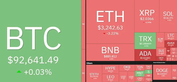 比特币徘徊于92000美元…山寨币温差明显
