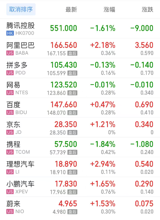 热门中概股方面,腾讯控股(港股)跌1.61%,阿里巴巴涨2.18%,拼多多跌0.13%,网易跌0.01%,百度涨0.47%,携程跌1.84%,理想汽车涨2.94%,小鹏汽车涨1.65%,蔚来涨1.53%。