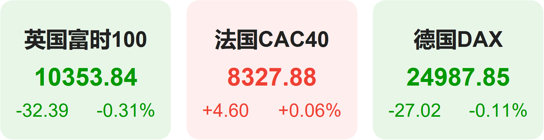 欧洲股市方面,英国富时100指数小幅下跌0.31%,报10354点。法国CAC40指数小幅上涨0.06%,报8328点。德国DAX指数小幅下跌0.11%,报24988点。