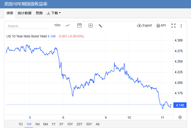 美债收益率全线走低,基准的10年期美债收益率收报4.148%,对美联储政策利率敏感的2年期美债收益率收报3.452%。
