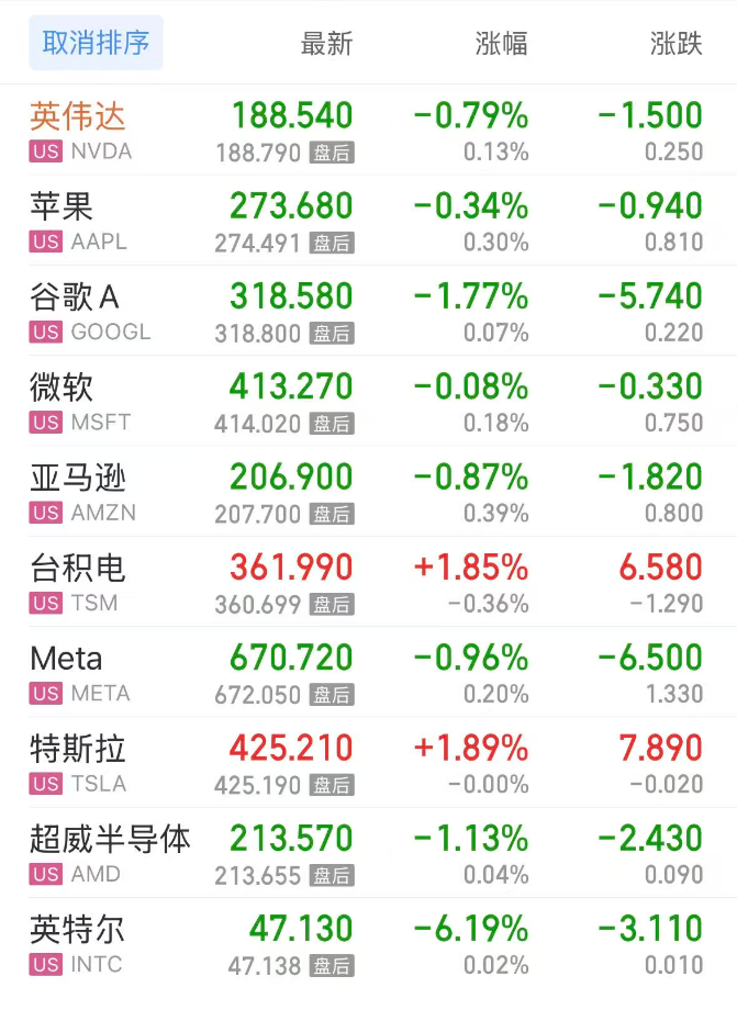 热门美股中,英伟达跌0.79%,苹果跌0.34%,谷歌C跌1.78%,谷歌A跌1.77%,微软跌0.08%,亚马逊跌0.87%,台积电涨1.85%,Meta跌0.96%,特斯拉涨1.89%,超威半导体跌1.13%,英特尔跌6.19%。