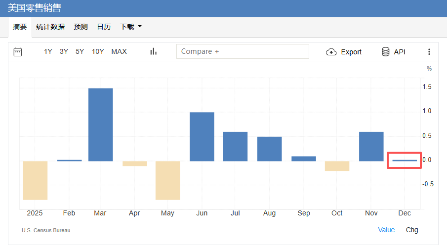 美国12月的零售销售表现不及环比增长0.6%的11月,也逊于华尔街预期的环比增长0.4%。假日消费动能疲软且不均衡。13个零售类别中有8个出现下滑,低收入群体支出尤为乏力。虽然高收入家庭受资产升值支撑,但整体消费受高物价与天气因素抑制。