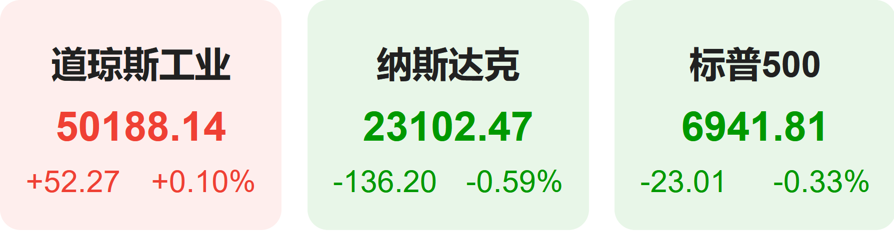 截至收盘,标普500指数跌0.33%,报6941.81点;道琼斯指数涨0.10%,报50188.14点;纳斯达克指数跌0.59%,报23102.47点。