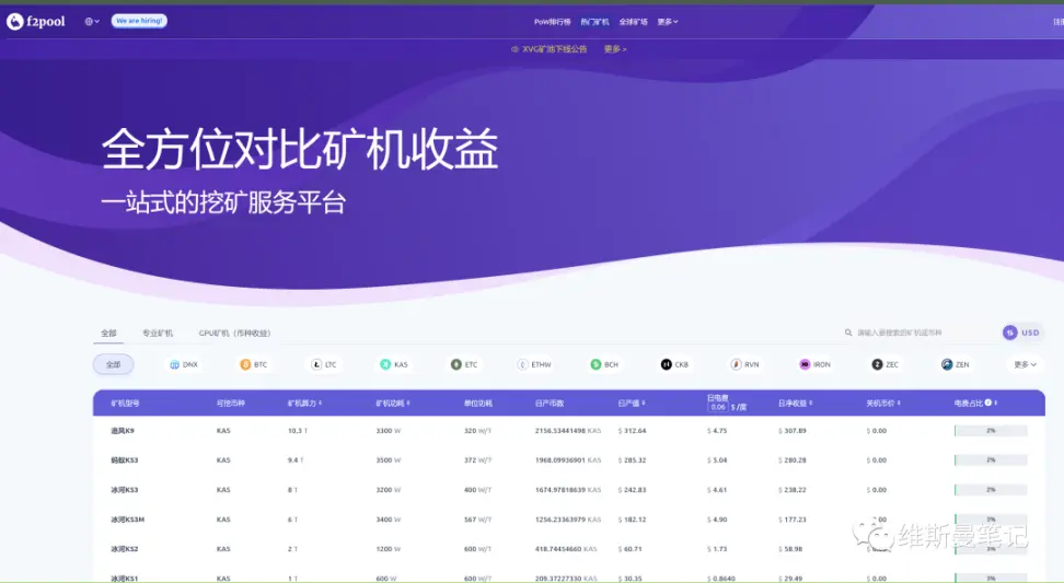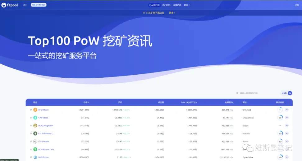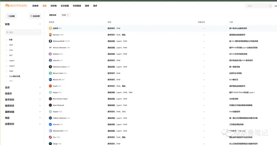 rootdata 有 PoW 专题标签,把里面的项目都看一遍,然后把关联项目,也都看一遍。再去各大矿池的公开信息页面,看具体 PoW 项目的产出信息,对矿机的要求。比如是 cpu 挖矿,还是 gpu 挖矿, 还是专门的 asic 矿机挖矿。下面截图来源鱼池。