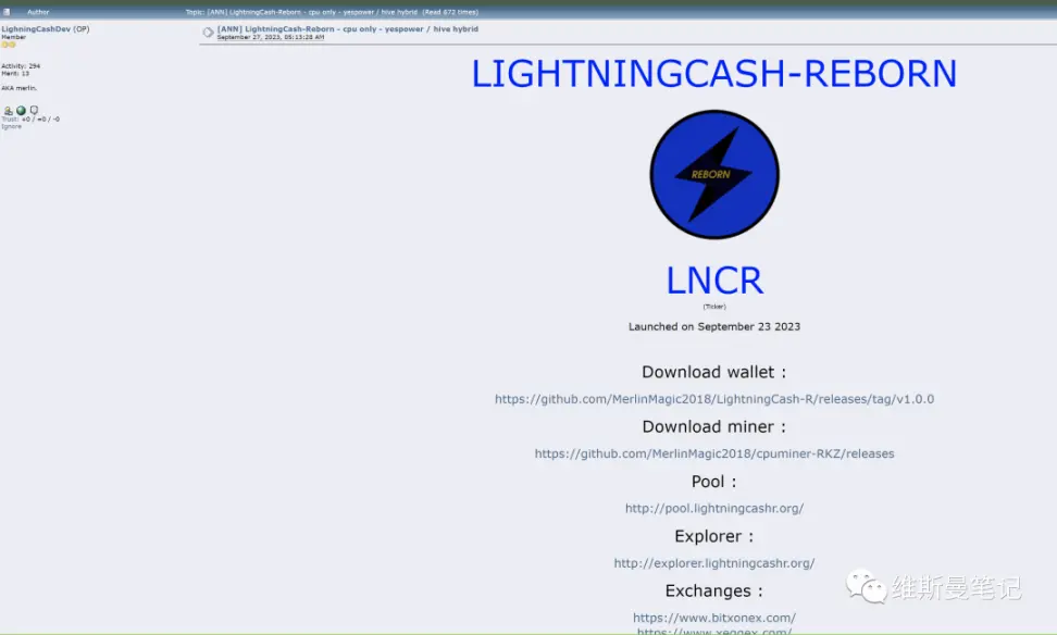 作为演示案例,我随意搜出了一个名为 LNCR 的 PoW 项目。一般而言,ANN 帖子会提供项目官网,以及各种连接。但同时也请牢记黑暗森林法则,这里很多未知来源的下载链接,很可能包含恶意软件。如果你想尝试,请不要在有资产的电脑上安装。