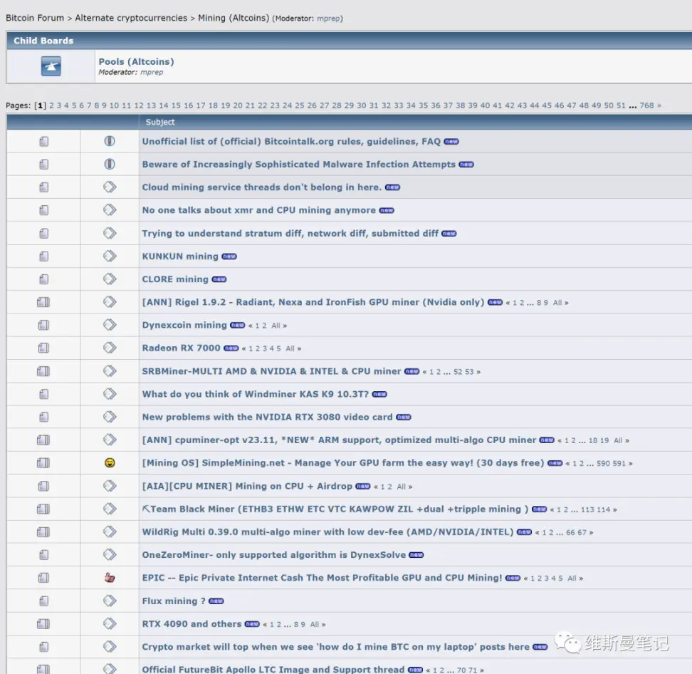 二、 打开 bitcointalk,点击 Mining (Altcoins) 版块,优先查看带有[ANN]的帖子。bitcointalk 是神坛不比多说,非常多的海外项目会选择在这里首发,而且活跃度也很高。这里出过最出名的人物,就是 Satoshi Nakamoto。但是,也由于这里的项目实在太早期了,普遍没有 GUI,需要有一定计算机基础使用命令行来进行配置。不过优势就在于,这类新项目往往不需要特定的 asic 专属矿机,普通家用 pc 或者高配 pc 就可以参与。你可以幻想一下你在 2010 年拿自己的电脑挖了 100 个 BTC 留到现在的场景。